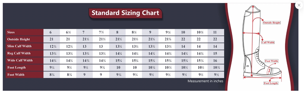 Measurements for the ladies WIDE Baroque tall Dress boots, Size 9 TuffRider Ladies Baroque Dress Boot